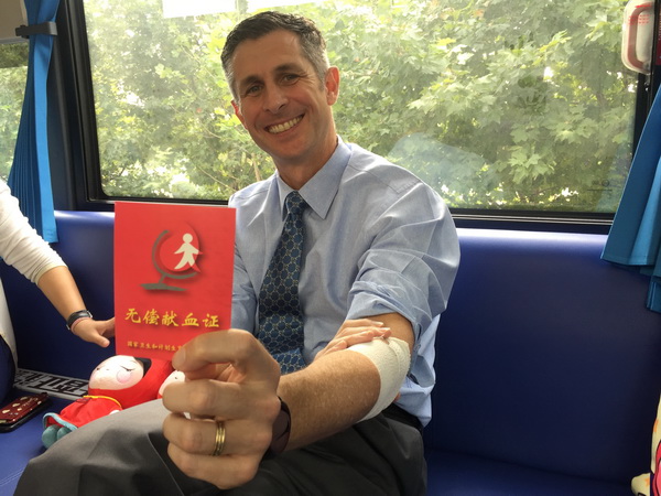 Jason Stinson的中文名叫史建森,是澳大利亚人,从开始填表、体检到献血,他始终保持着灿烂的笑容,作为天津市香格里拉大酒店的总经理,他说这已经是他第四次献血了,前三次献血也都是在中国。开始献血时,Jason Stinson说,其实他很不喜欢打针,有点惧怕针头,但是,想着无偿献血是很好的事,心里那点小情绪也就不算什么了。同时,他还总是费力的告诉身边的人,要尽可能的多参加无偿献血,因为血液是可以再生的,自己不会损失什么就可以帮助很多的人,而且这种帮助是无国界的。