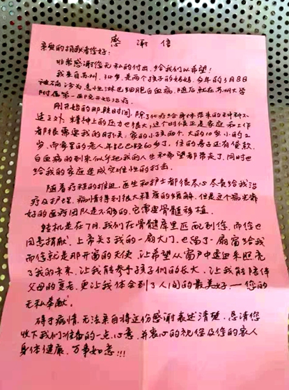 好事多磨。在捐献前最后一个过程——体检阶段中,因为经常上夜班,休息不好,检查结果显示宁晓阳目前的身体状况并不适合进行捐献,工作人员与他交流后,他很是焦急,询问如何才能调整,他坚持训练,合理控制饮食及休息,争取让身体状况达到最佳的一个状态,经过一番调整,终于符合了捐献要求。在等待捐献的日子里,他一直牵挂着患者的情况,希望通过努力去挽救他人的生命。在注射完第4支动员剂后,他在捐献工作群里留言“点滴之行,皆由心起”。在捐献的现场,经过四个多小时的采集,造血干细胞分离完成,他的心愿也终于圆满。随后患者所在医院前来取造血干细胞时,也一同将远方一封沉甸甸的感谢信送来,患者所在医院工作人员为大家读了患者写给宁晓阳同志的感谢信,信中表达了对捐献者的感恩之情,他们虽相隔万里,但彼此的心意却因这根流淌着希望的针管相通。细心的晓阳还给患者准备了一个小礼物,祝愿患者早日康复,在给患者的信中说到:“愿点点微茫,点燃熊熊之光,照亮你今后的一生,一切都是最好的安排”。