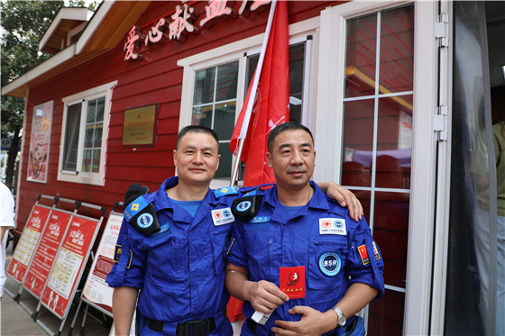 (蓝天救援队队员王海华(右)再次无偿献血)
