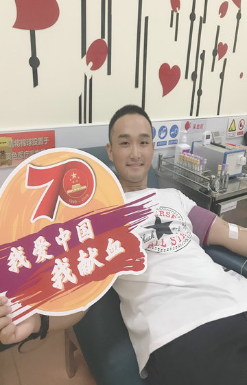 10月1日,家住长兴岛的秦至成冒着风雨特意赶来宝山献血屋捐献400毫升热血,坚持每半年间隔期一到就奉献爱心,他表示一边看着阅兵式一边献血非常有荣誉感,充满了正能量,要以自己的实际行动为祖国庆生。
