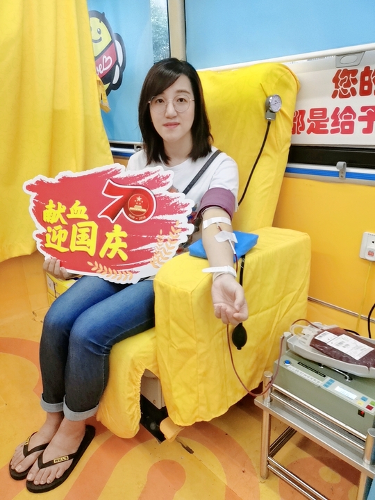 赵冬燕女士来到虹桥艺术中心捐献400毫升热血,这是她第五次参加无偿献血,她表示以献血的方式来庆祝中华人民共和国成立七十周年十分光荣与自豪。