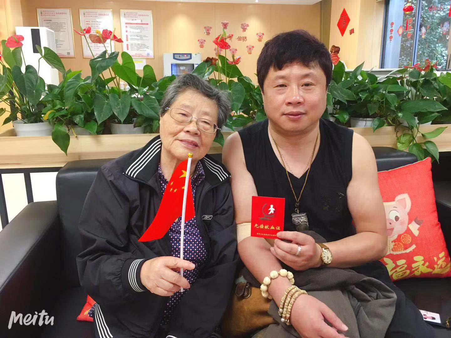 当天是牟亦军第六次献血。一大早,牟亦军带着七十二岁的老母亲,特意从下沙赶到武林院区献血。他说,在这个特别的日子里,他想以无偿献血的方式为祖国母亲庆生,同时也祝愿母亲身体健康,长命百岁。献好血后,还要和母亲一起观看大阅兵呢!