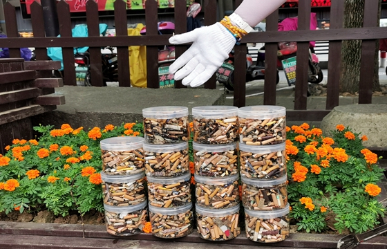 今天捡拾队伍中一位机灵活泼的小男孩特别引人注目,他是来自柯桥区马鞍镇中心小学马鞍校区五年级的周铭烨。前些天听妈妈说有这个活动,一直缠着妈妈要求一起参加,今天早早起床,和妈妈一起从马鞍来到市区鲁迅故里。只见他一会儿弯腰抠着石板缝中的烟蒂,一会儿用长夹捡拾够不到的花坛里的塑料盒,忙得不亦乐乎,看到烟蒂慢慢在手上盒子里满起来,他高兴地说:“我就爱和妈妈一起做些有意义的公益活动,希望我们的环境能变得越来越美丽。