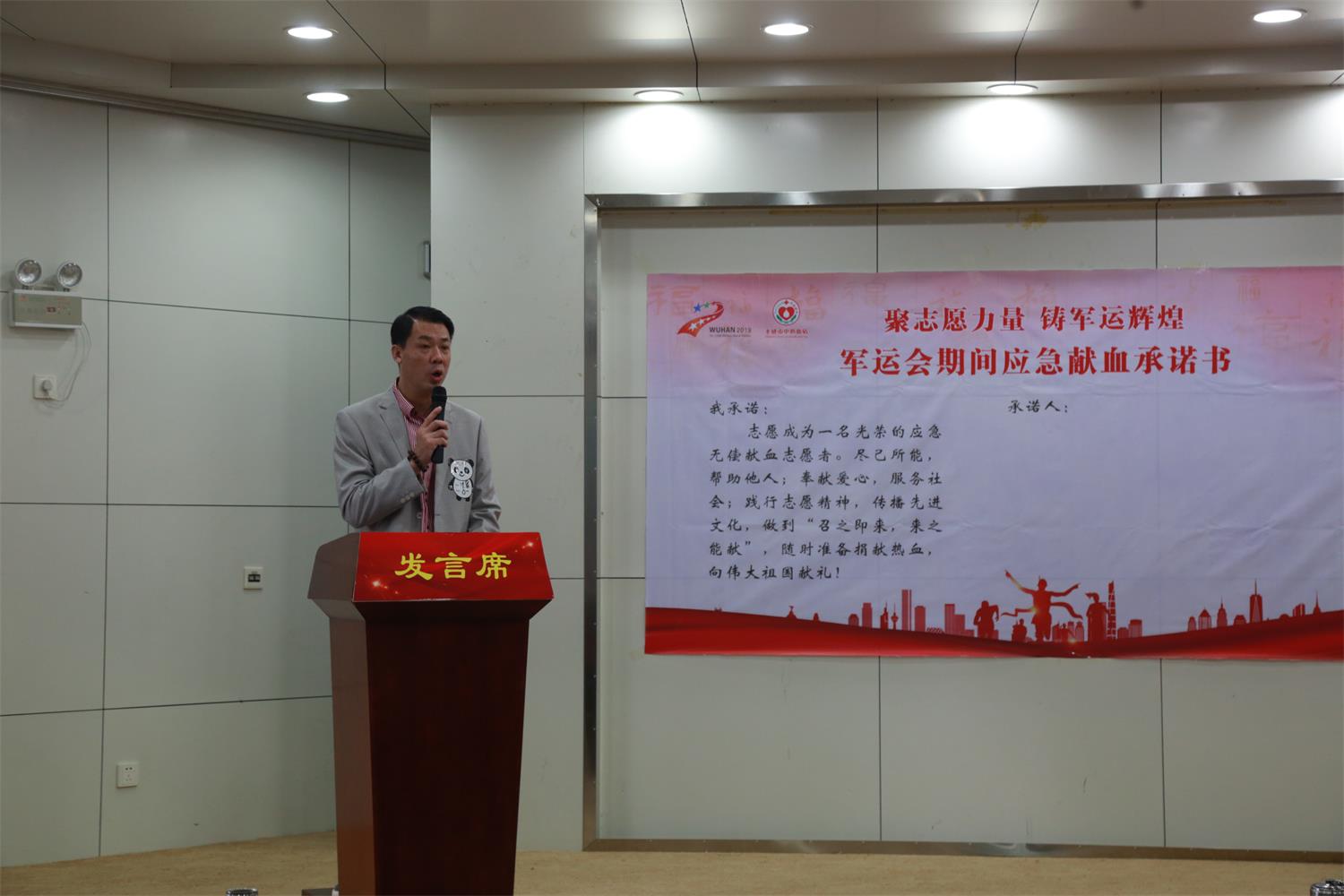 孝感市红十字无偿献血志愿服务队稀有血型分队副队长叶军主持联谊会并领读应急献血承诺书