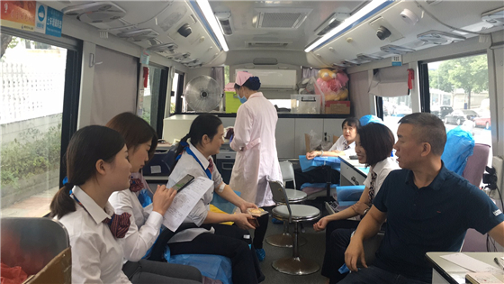 (采血车上坐满了前来献血的员工)