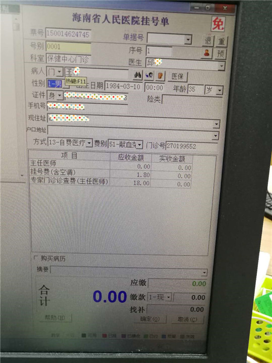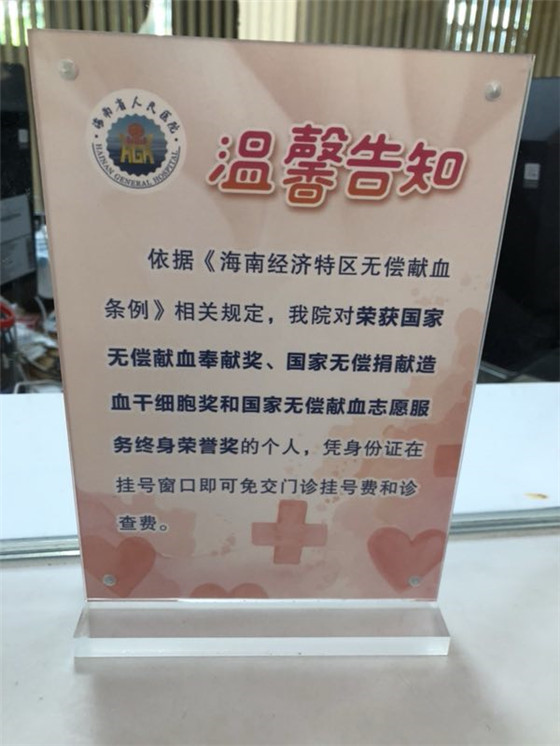 “真没想到,我们献血者还能享受到这种待遇。”海口市民、国家无偿献血奉献奖获得者王先生高兴地说到。10月10日上午,王先生到海南省人民医院就诊时,挂号处的工作人员通过身份证自动识别,为其免除了门诊挂号费和诊查费。