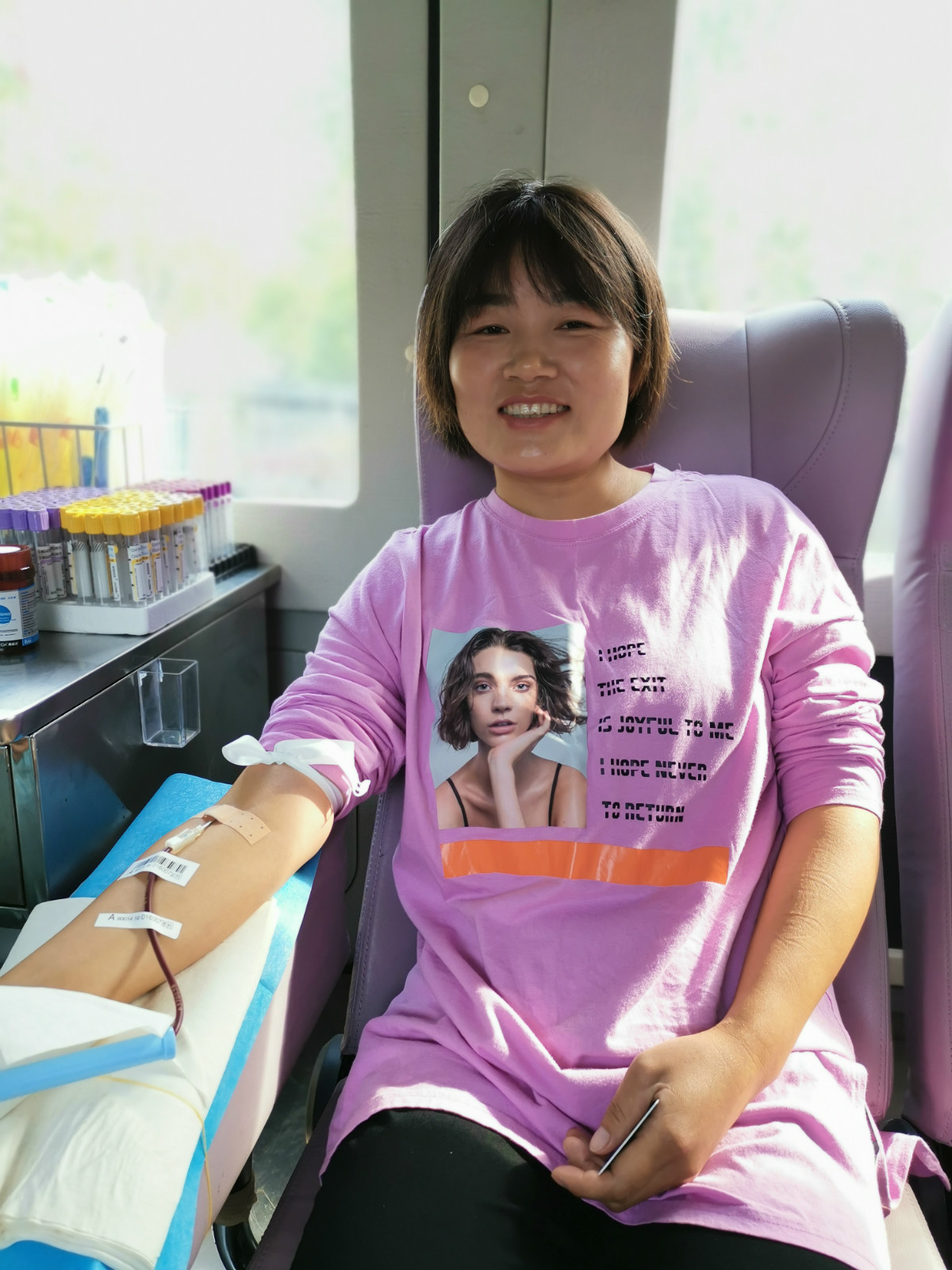周丽第一次献血是在上海,今天一早特意从家里赶到镇上献血。