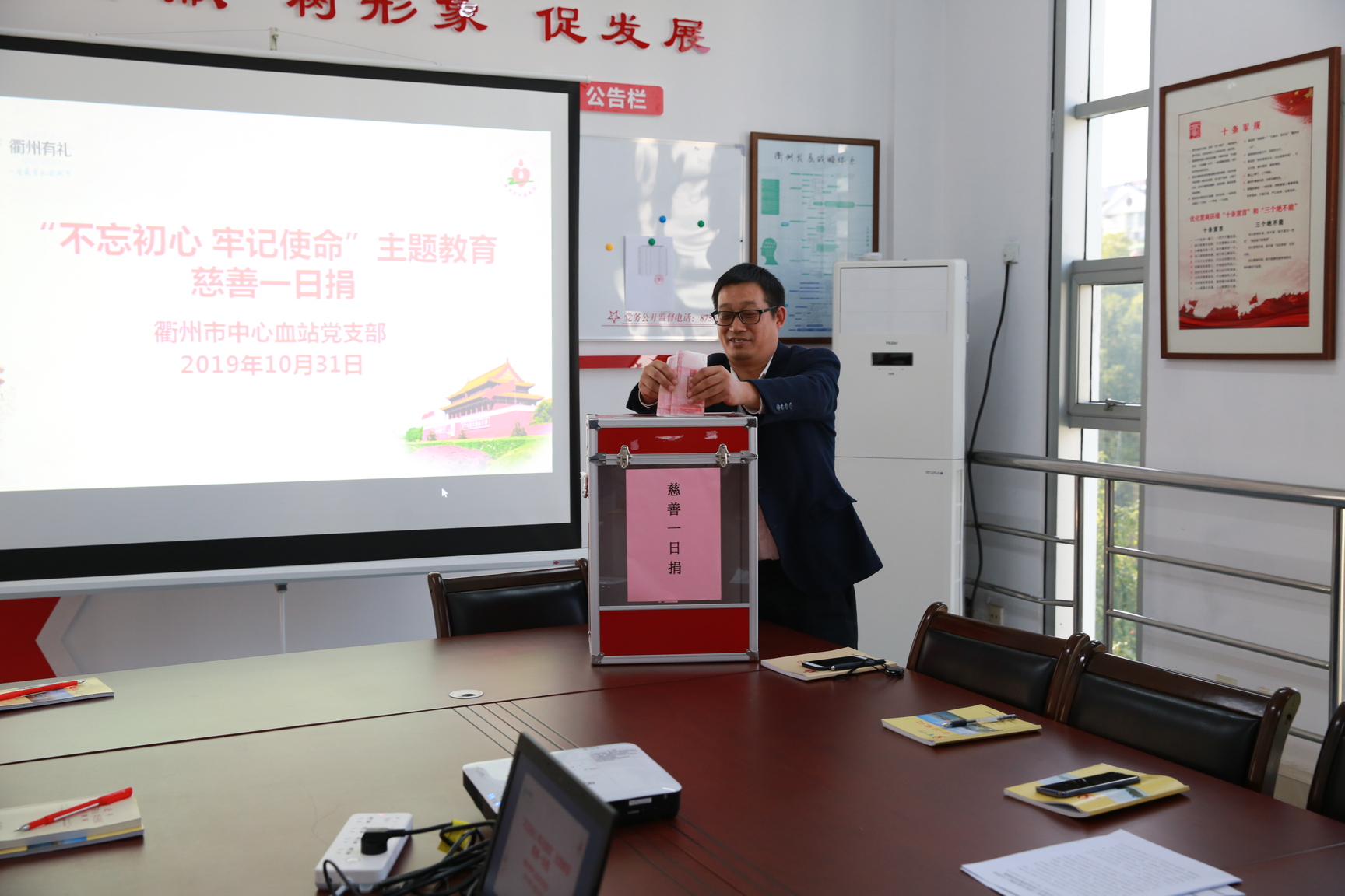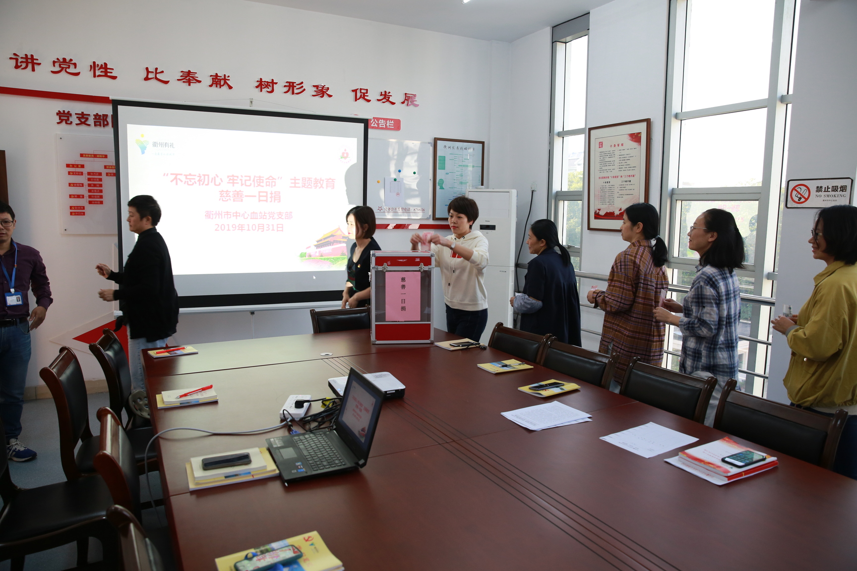 为了弘扬慈善理念,奉献爱心,10月31日下午,衢州市中心血站结合正在开展的“不忘初心 牢记使命”主题教育,响应中共衢州市委直属机关工作委员会和衢州市民政局的号召,开展“慈善一日捐”活动。