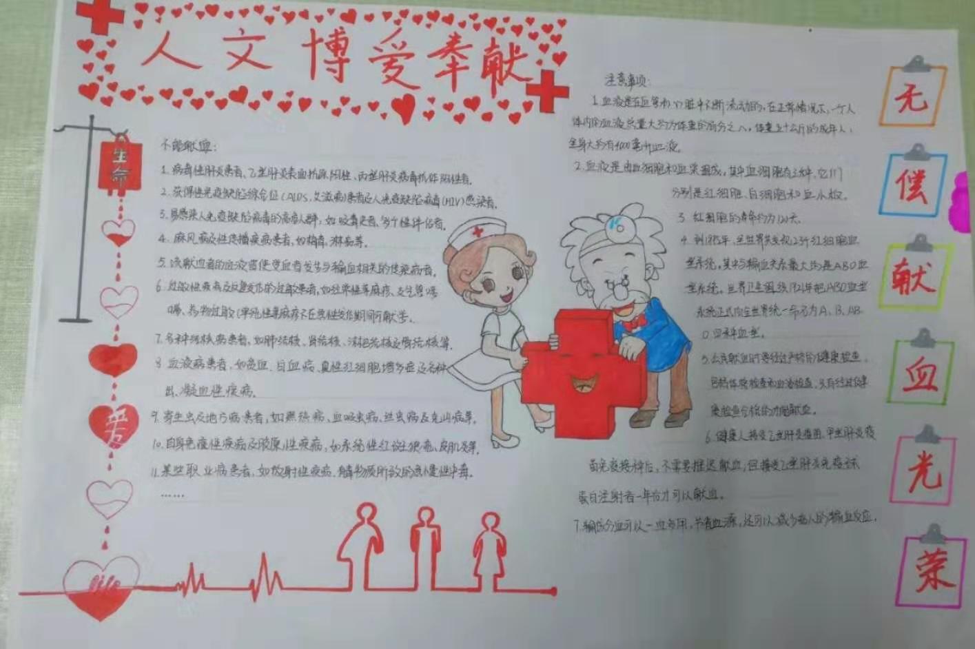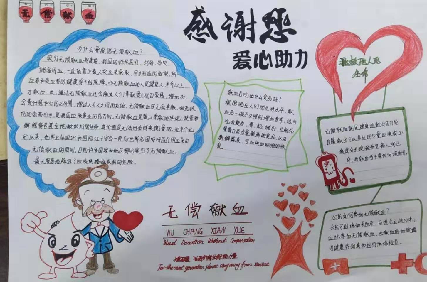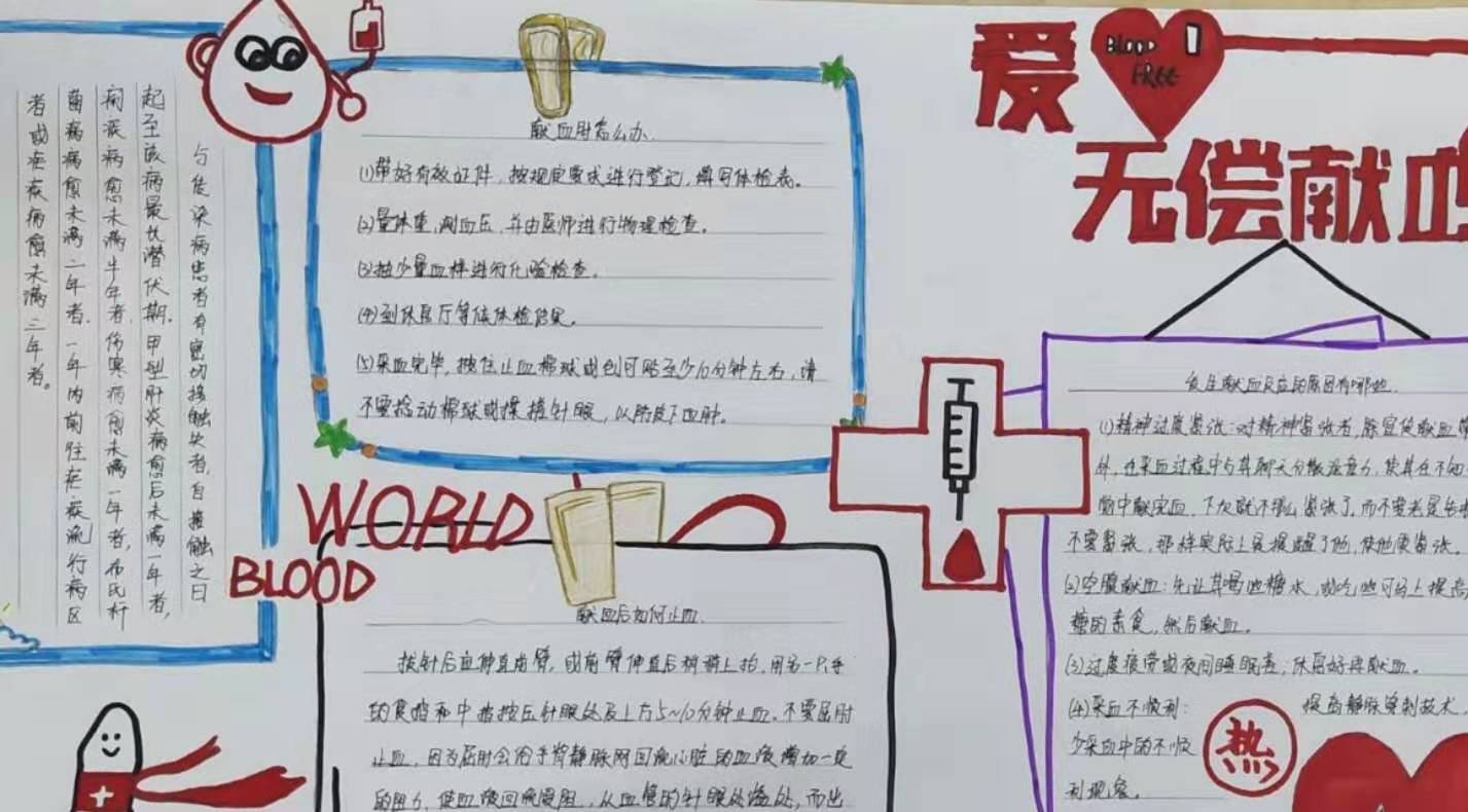 本次活动的参赛作品由同学们自行设计,紧扣无偿献血的主题,并于指定时间上交进行网上评选。上交的手抄报内容丰富多样,让同学们从一笔一画、一字一词间领会温暖,传递感动。他们用精美的图画,优美的文字,表达着他们对无偿献血最直观的理解。