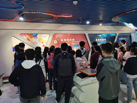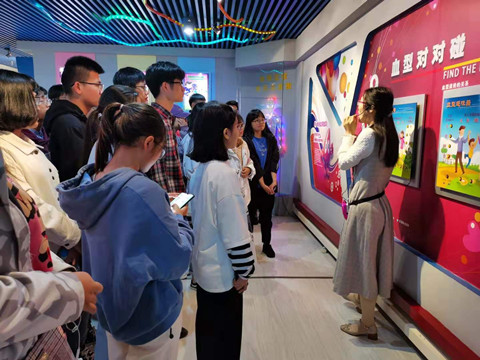 前往四楼科普教育基地,一出楼梯口,便看到周围墙上挂满了牌子、照片。展台里还放有许多输血仪器,许多好奇的同学们围成一个圈仔细去看上面的构造。接着还去了二楼待检血室,冷冻柜里存放着分别放有4种血型,还有医生正在为血液采集做分类。