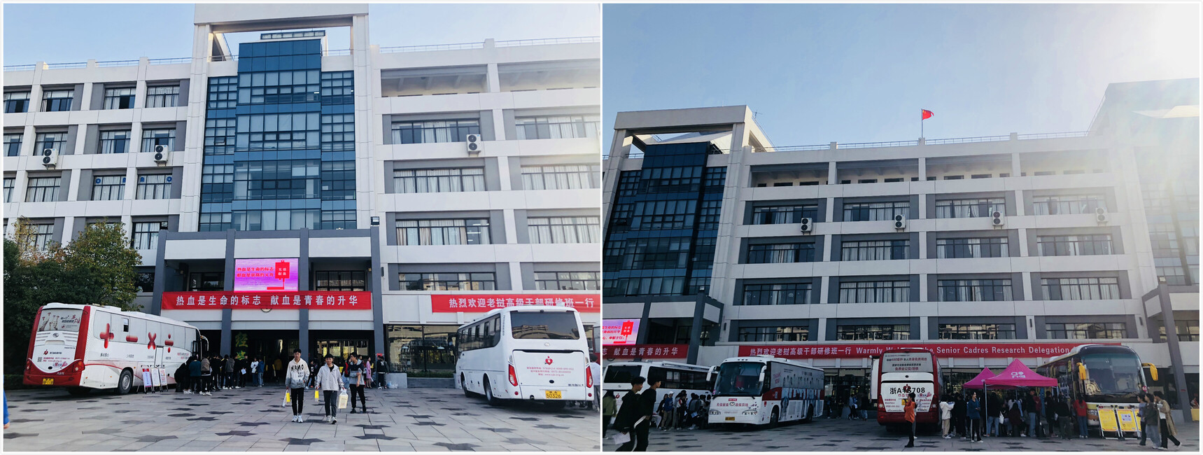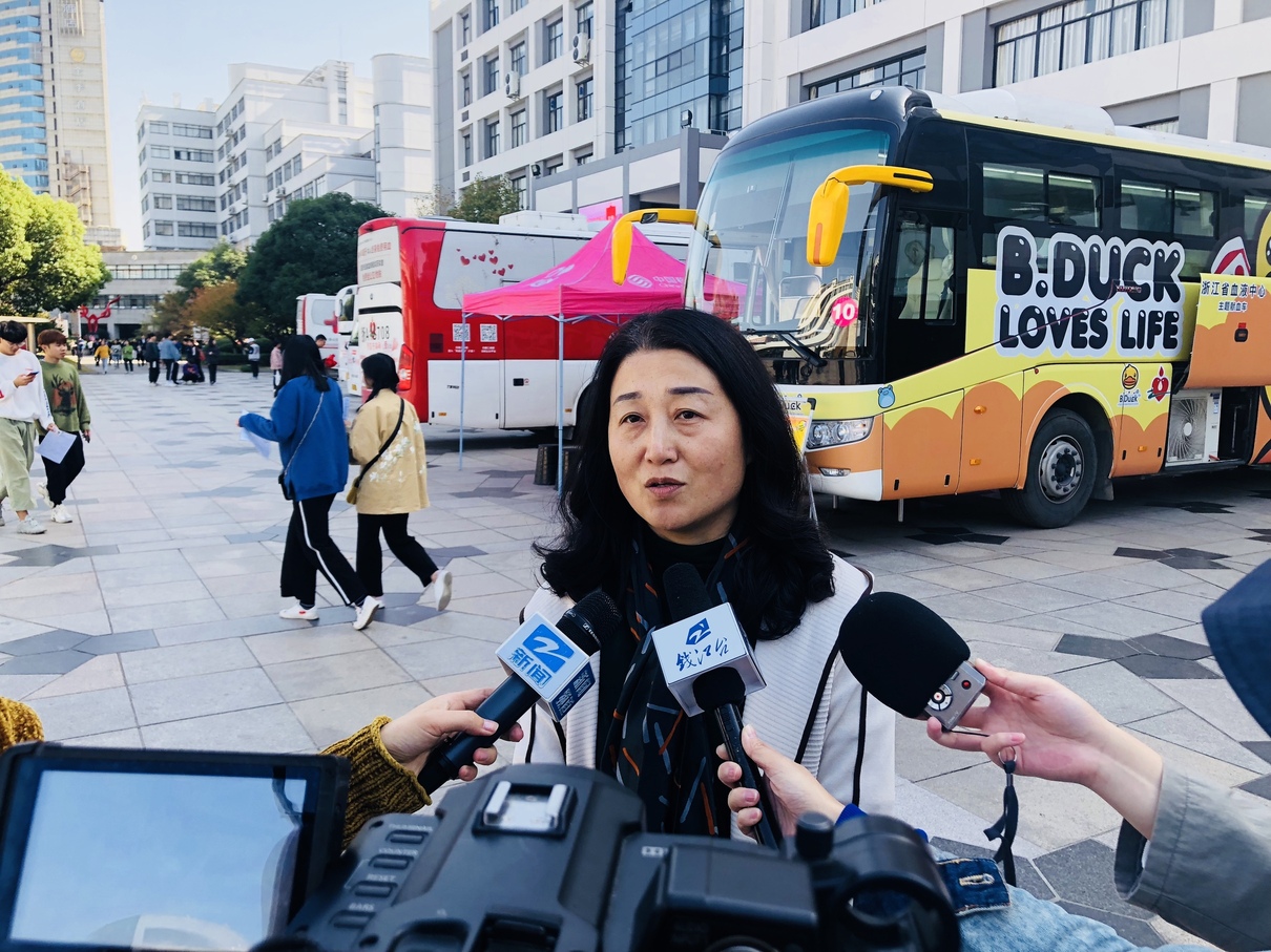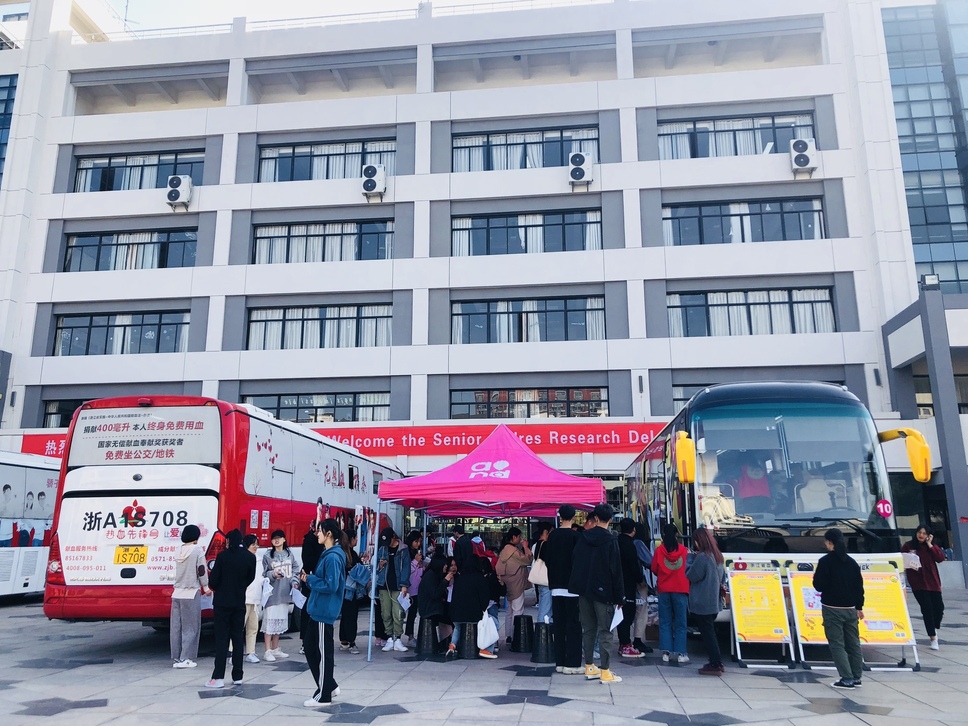 2019年11月14日上午,来自浙江省血液中心的六辆流动献血车“齐刷刷”停靠在浙江育英职业技术学院一号教学楼广场上。从上午十点开始,前来参加献血的学生络绎不绝。本次活动持续近8个小时,共计882名师生成功献血,献血总量达268070毫升。