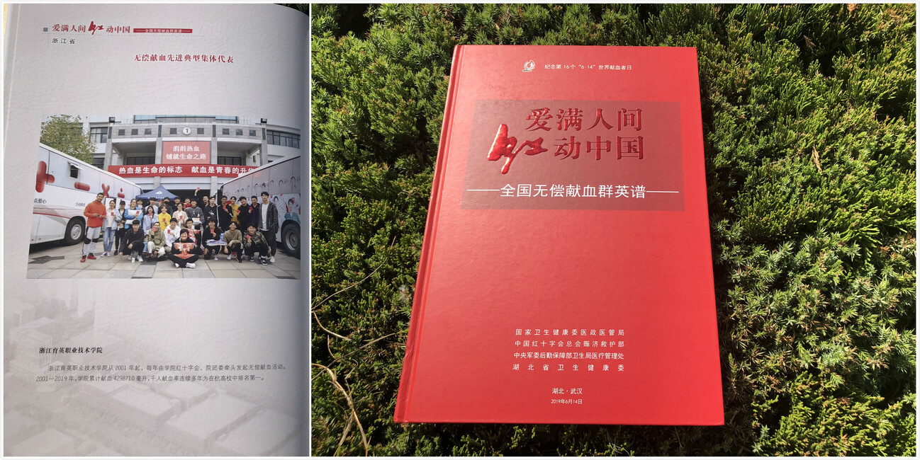 2001年-2019年,19年间共有14626名师生参与无偿献血活动,累计献血4298710毫升。2019年,浙江育英职业技术学院作为浙江省无偿献血先进典型集体代表入选《爱满人间 红动中国》全国无偿献血群英谱,全国获此项殊荣单位仅34家,育英学院是浙江省唯一获此项荣誉的单位。
