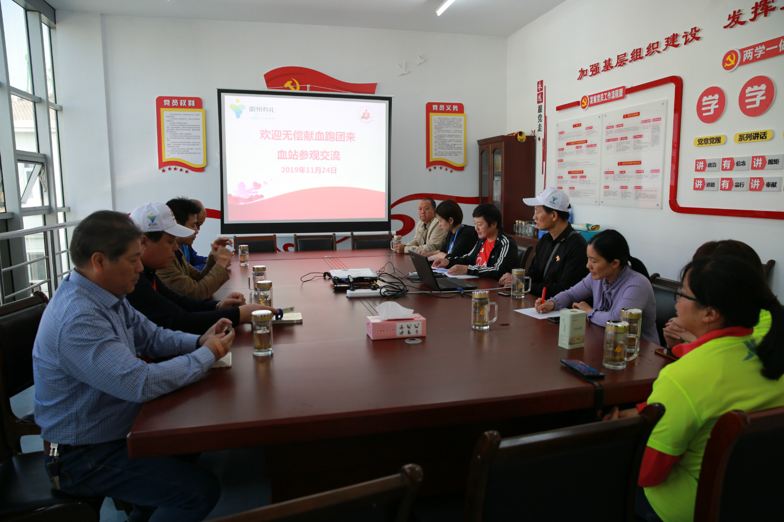 2019年11月24日10:30,2019年衢州迷你马拉松比赛刚刚结束,参加衢州市无偿献血者跑团的上饶市无偿献血志愿服务队队长卢谋林一行就来到我站参观,就无偿献血志愿服务如何开展与我市无偿献血志愿者服务队队员们进行了互动交流。