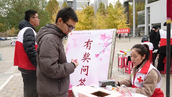 河北师范大学志愿者向同学们宣传无偿献血知识