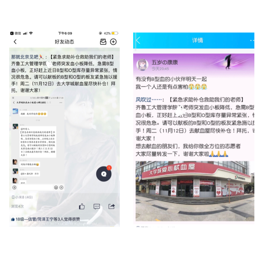 2019年11月11日星期一,是中国人民解放军空军70岁的生日,也是年轻人像过年一样的日子-购物节,还是大学城献血屋经过周六日两天奋战后的休整日。下午5:22,大学城机采血小板爱心群里,齐鲁工业大学的姜洪雷书记发布了一条救助信息,这个群经常会在病患急需用血的时候发布信息,召集群里的爱心板友前来奉献爱心。