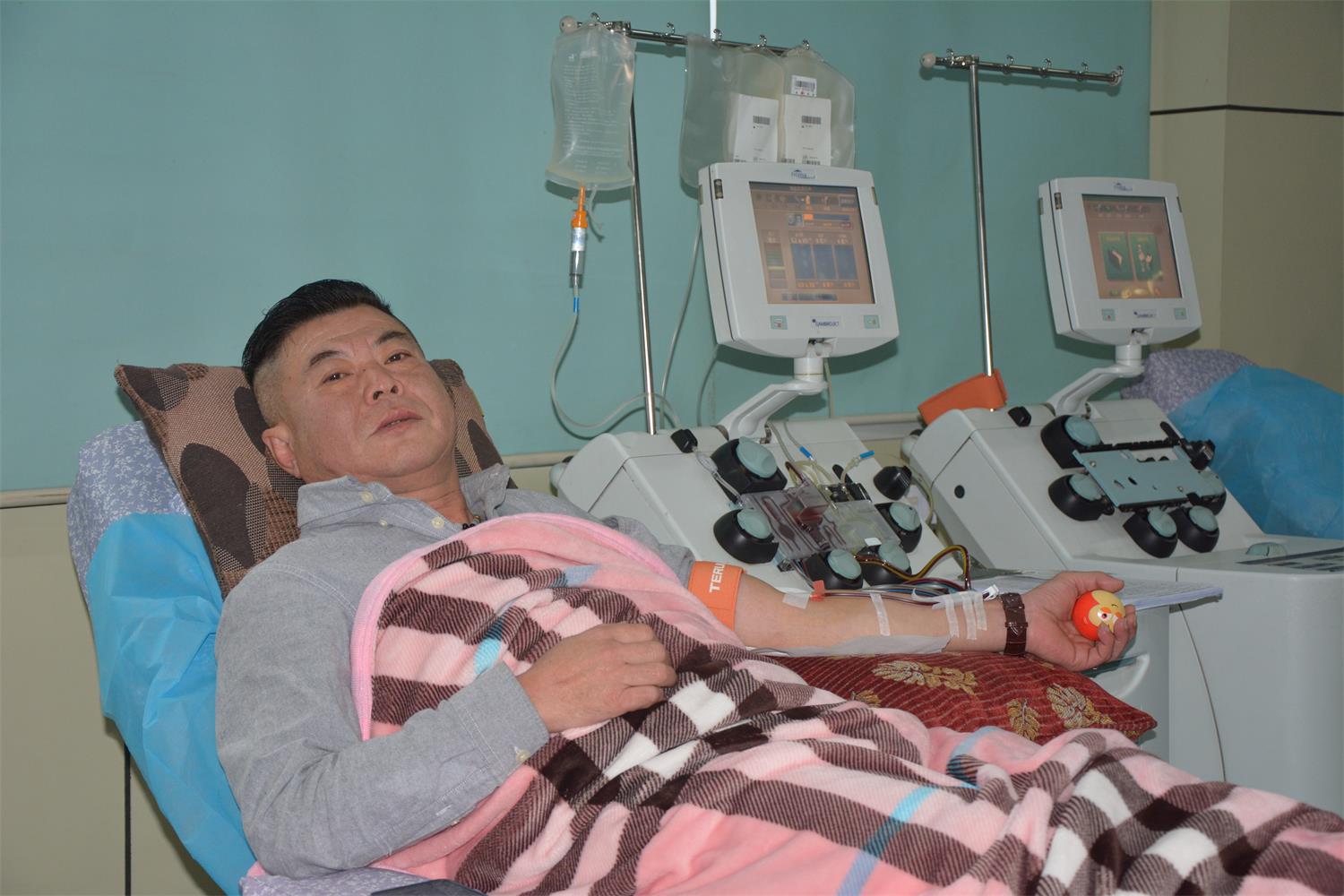 11月25日,56岁的罗品余迎来了他的第103次献血。他冒着雨雪天气从安陆赶到孝感市中心血站,经过一系列对罗品余来说再熟悉不过的步骤,鲜红的血液缓缓流出,经过血细胞分离机,分离出血小板,其余成分又缓缓地回输到他体内,不到一个小时,他完成了这次血小板捐献。