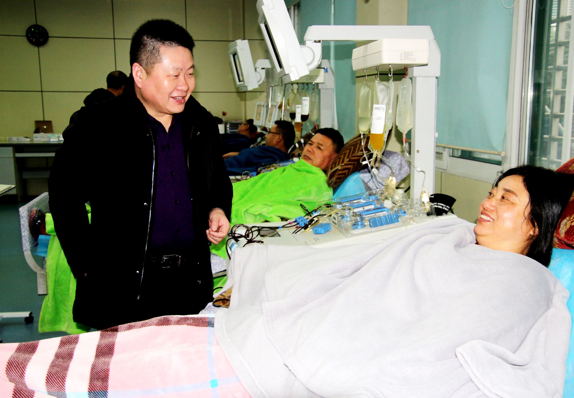 孝感市中心血站献血服务科副主任张红云看望正在献血的胡香姣