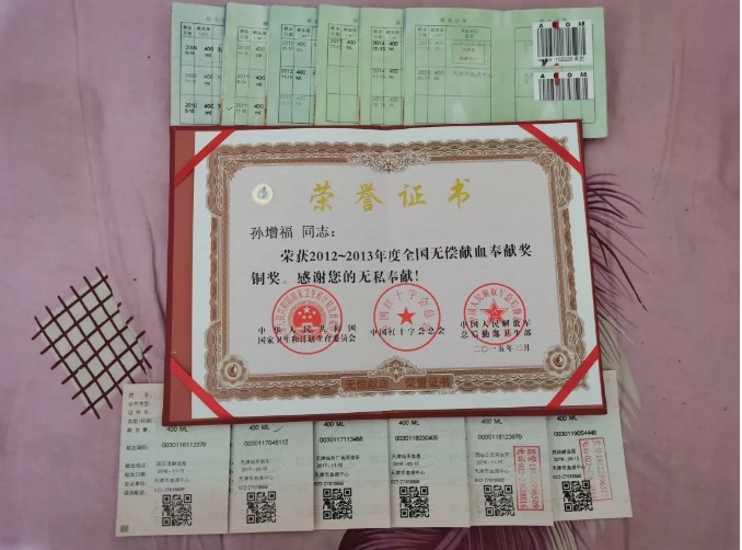 思绪的起点定格在2009年5月15日,一个令人难忘的日子,一个属于孙增福的“历史性的起点”。那一天,他早早地起床,来到了天津市血液中心的献血车前。进去后,登记填表,量血压,抽血化验……一切都合格了!那一刻,他仿佛听到自己的心跳。那是因为初次献血的紧张,还是因为即将奉献的激动?他不得而知。但是,不管怎么说,这是他人生中的第一次,第一次以无偿献血的方式,义无反顾地挽救生命的行动!