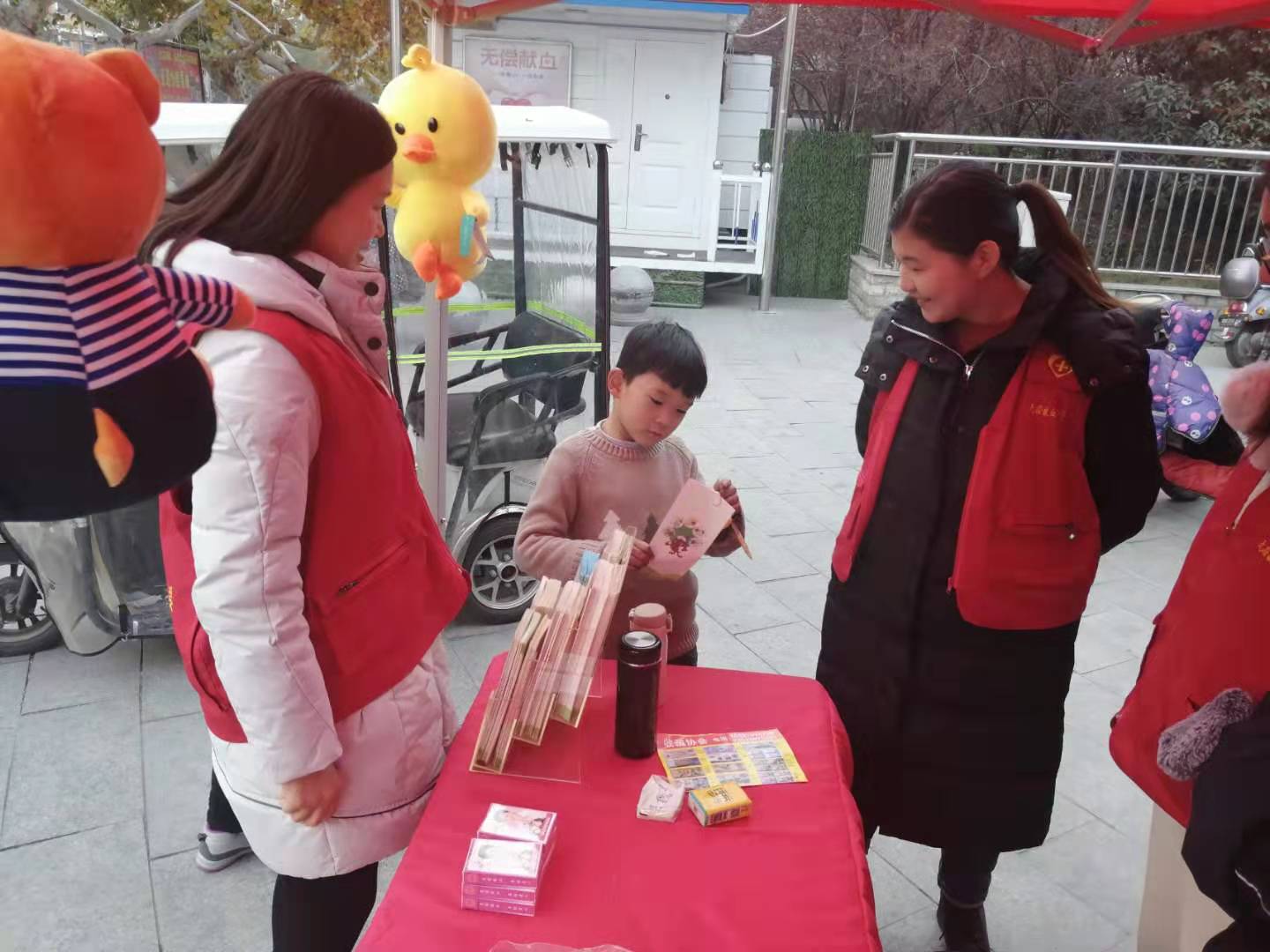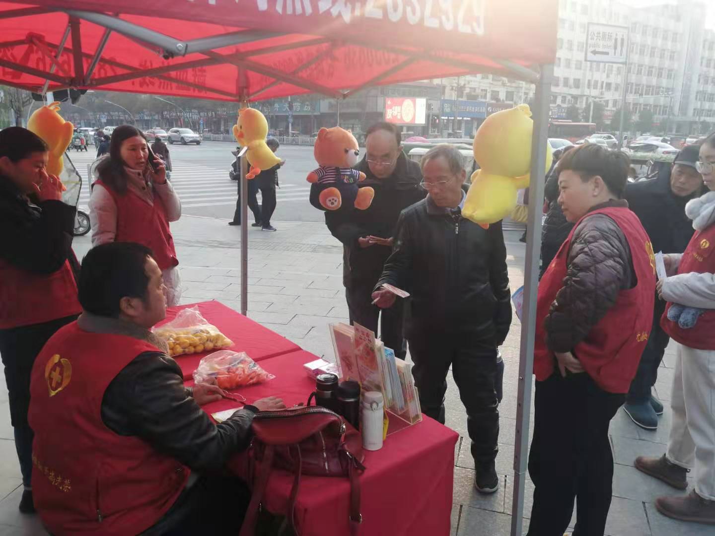 12月13日,驿城区靖宇广场上,一群身穿红色马甲的无偿献血服务志愿者来到献血屋旁开展无偿献血知识宣传活动。 现场,志愿者们摆放桌椅、宣传展板,分类归置各种纪念品,准备工作就绪后,大家匆匆走进人群,为过往的群众发放“无偿献血宣传单”,各项工作驾轻就熟。他们热情洋溢,帮助老人过马路,给小朋友讲解血液知识,为驻足观看展板的人详细讲解展板内容,指导参与献血的人员填写“献血登记表”,为成功献血的爱心人士发放纪念品,尽己所能的做好无偿献血服务工作。
