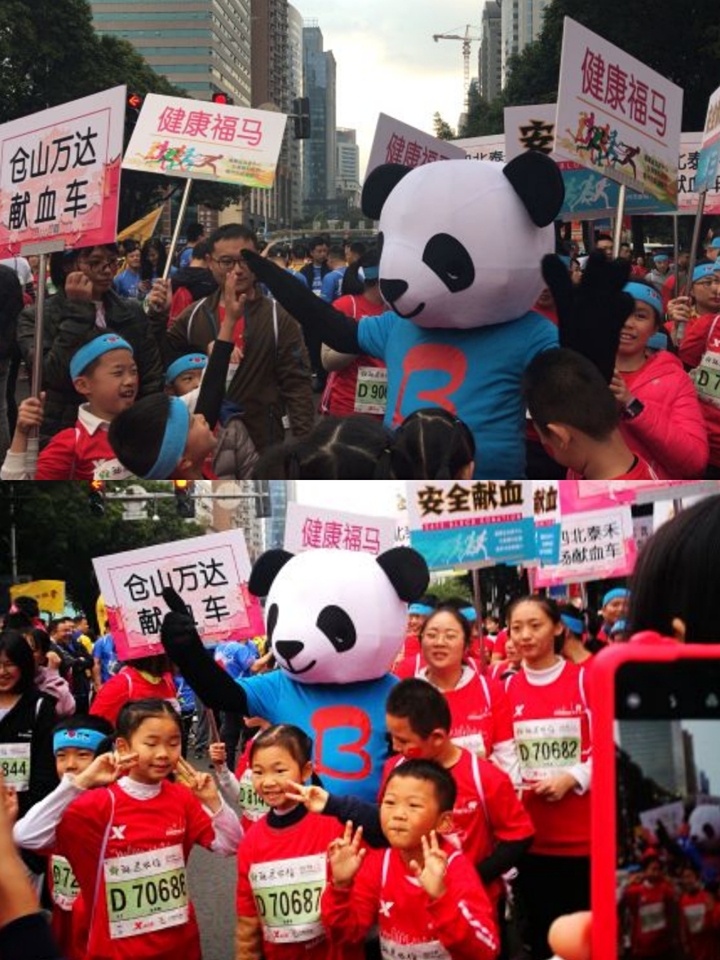 四位熊猫是现场当之无愧的“明星”。在前行的过程中,不断有跑友停下与熊猫合影,还有小朋友紧紧拥抱熊猫不舍放手。