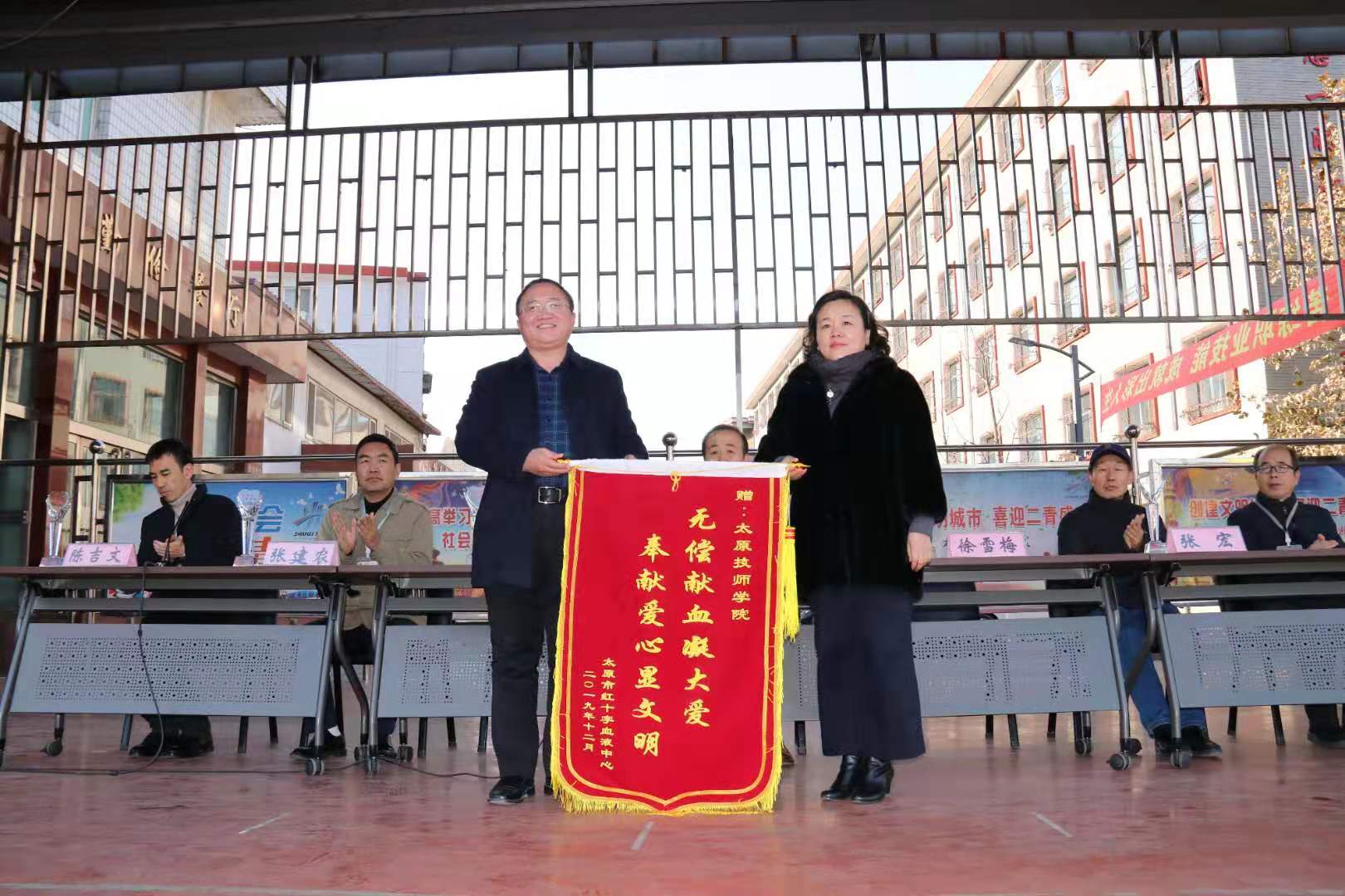 血液中心白林主任为学校领导送上“无偿献血凝大爱 奉献爱心显文明”的锦旗,感谢太原技师学院多年如一日地对无偿献血事业的支持。