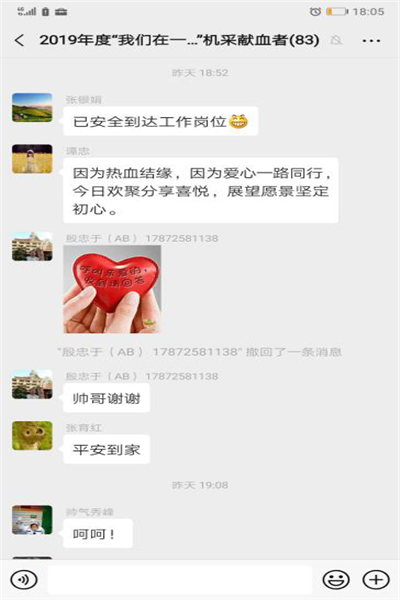 在满满的幸福感中,机采献血者们结束了一天充实的行程。归家后,大家纷纷在活动微信群中畅所欲言,表达感谢,抒发无偿献血者的“初心”与“使命”:捐我热血,救人性命!