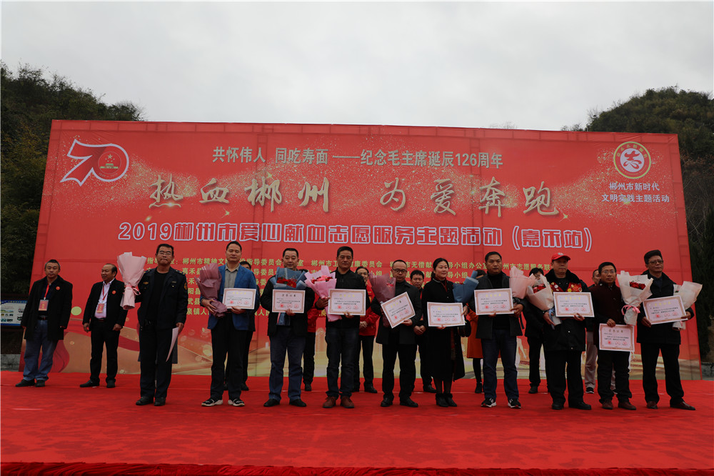 郴州市中心血站站长李孟祥与受表彰的献血者合影