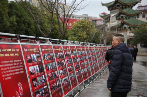 (现场进行无偿献血图片展,县城居民驻足观看)