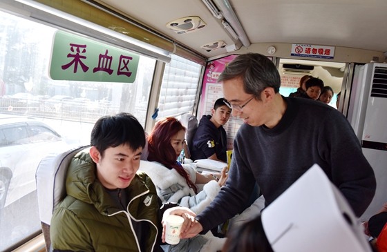 上阵不离父子兵,为献血的儿子服务的王俊生(马克 摄影)