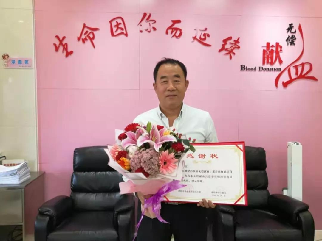 洛阳市第110位百次无偿献血者来庆东 :第1次献血:2010年8月31日,第100次献血:2019年9月14日。期间共捐献全血1次400毫升、捐献机采成分血100次178治疗量,两次荣获全国无偿献血奉献奖金奖(2016年、2018年)。