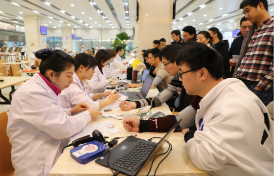 上午九点的市政府5号楼大厅内,机关工作人员在医务人员和志愿者的指引下有序进行网上填表登记、征询、测量血压、检验初筛,然后排队等候献血。为了避免空腹献血,血站还为献血者准备了红糖水和面包。