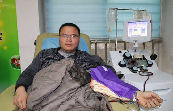 2020年1月7日,济宁天气寒冷,大雪下个不停,外面行人稀少,而梁山的亓海龙却济宁市中心血站机采室内已在献血。