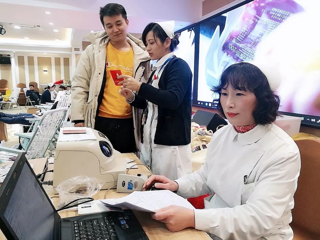 医护人员马不停蹄地为无偿献血者测量血压、抽血,又耐心地讲解无偿献血后的休息、饮食等注意事项,不时地观察他们的身体状况。