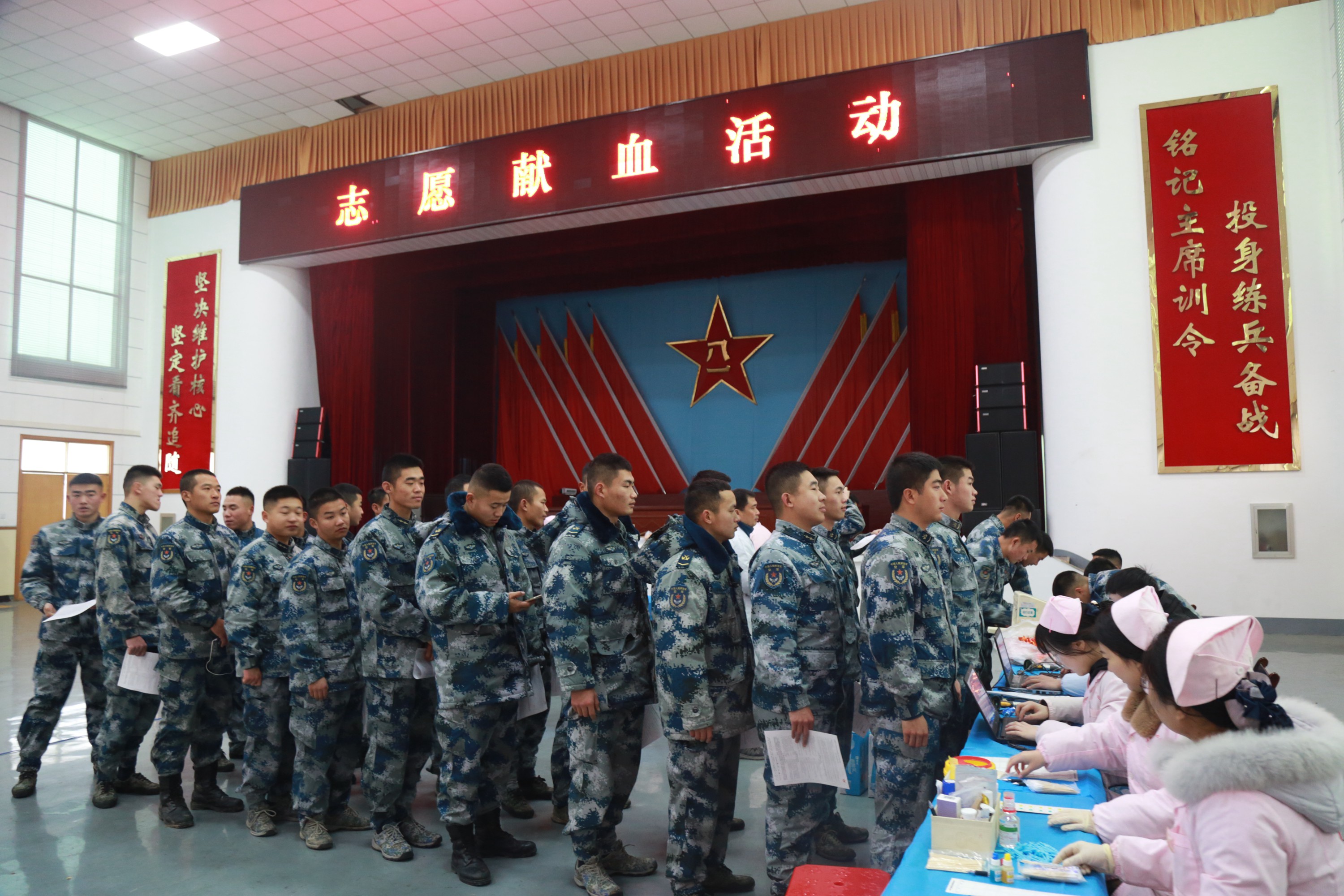 早上8时,采血车冒着大雾抵达目的地,指导员一声令下,按照事先定好的时间排序,在最前的一个连迅速集合,整齐列队准备参加献血。当看到护士们正搬运采血物品时,官兵们立即走到捐血车前,排起了长龙,接力运送物资,这一幕让工作人员联想到抗洪抢险的时刻,不由让人更生敬意。