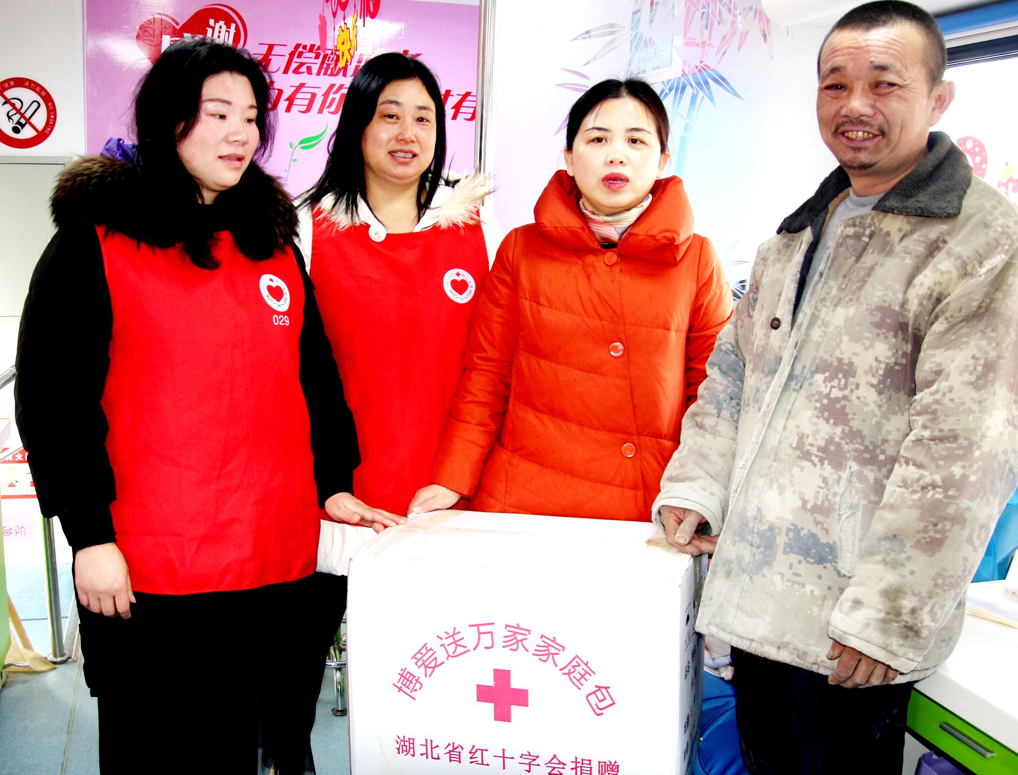 1月14日上午,孝昌县红十字会专职副会长余素林与无偿献血志愿者胡香姣等组成慰问组,来到孝昌新城区金润超市前的采血屋,给无偿献血志愿者杨国文送上家庭包等慰问品。