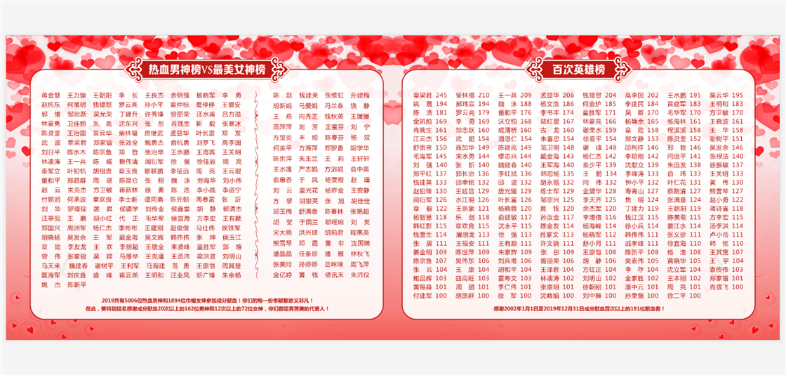 我们欣喜地看到固定成分献血者的队伍在日益壮大,2019年机采血小板捐献3次及以上的献血者达到2855人,累计捐献22686人次,年人均捐献次数达到7.95次。由于篇幅有限,在这里未能全部提及您的名字,但您的每一次奉献都意义非凡!都闪亮着属于您的美丽光芒!在此,要特别提名感谢2019年成分献血20次以上的 162位男神和成分献血12次以上的72位女神,您们都是真善美的代言人!现将您们的名字在以下《光荣榜》予以公布,并对您们的高尚行为表示最崇高的敬意和衷心的感谢!