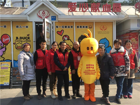 2. “有爱 就有未来”——无锡市红十字中心血站无偿献血志愿服务队红马甲分队在崇安寺爱心屋开展无偿献血宣传活动。市中心血站红马甲志愿者在崇安寺不畏严寒,积极向路人宣传无偿献血知识和江苏省三免政策,通过自购的玩偶服装来吸引周围市民目光,引导市民走进献血屋了解无偿献血流程。志愿者在空闲之余,还为爱心屋进行圣诞节日装扮,营造温馨的献血氛围,此举吸引了很多年轻人的欢迎。