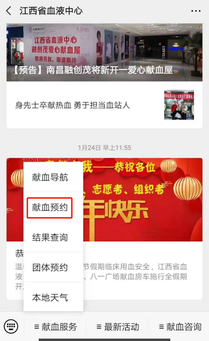 为给爱心人士提供更便捷、安全、温馨的献血服务,江西省血液中心所有固定献血点已全部开放,工作人员坚守岗位,每天严格执行环境、设备设施等消毒程序,提供体温监测、口罩免费发放服务,同时,为避免人群集中,倡导大家通过以下方式完成献血预约后再分时间段前往献血点。