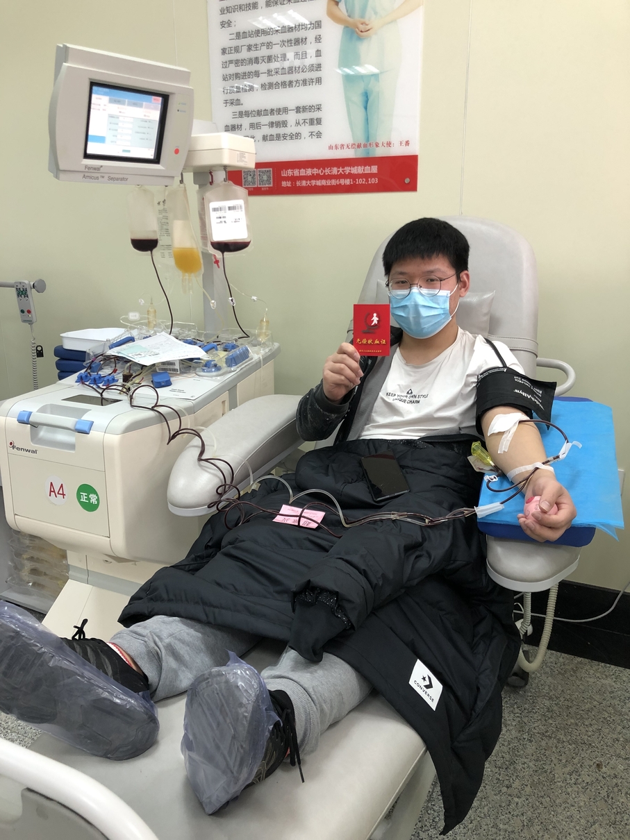 疫情、封校也阻挡不了杜绪辉同学来献血的脚步,看到微信群里有病患需要用血的消息,为人谦和有礼的他克服困难前来献血,并坚持捐献机采血小板2个治疗量。