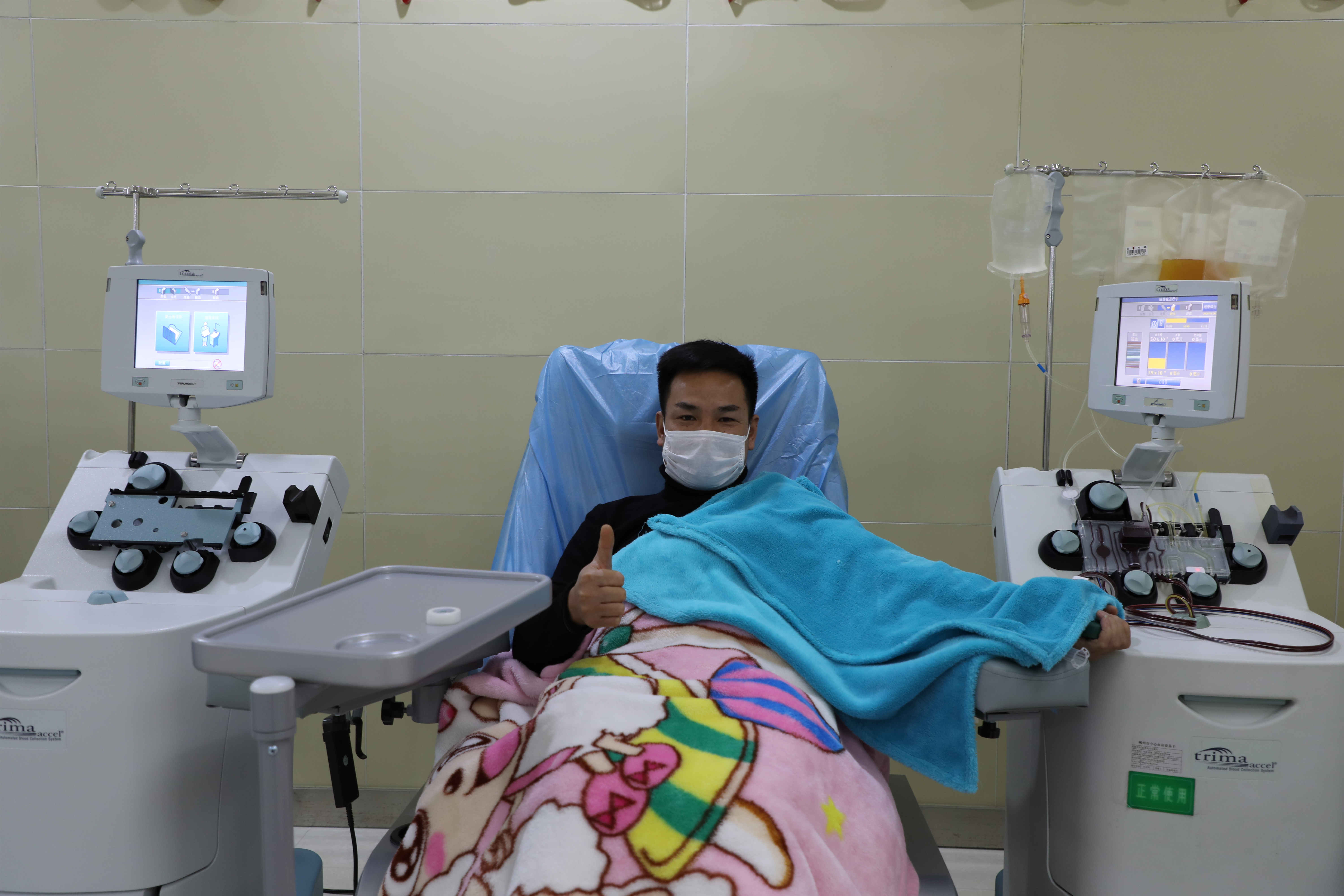 (安仁县无偿献血志愿者分队队长钟夏文正在献机采血小板)