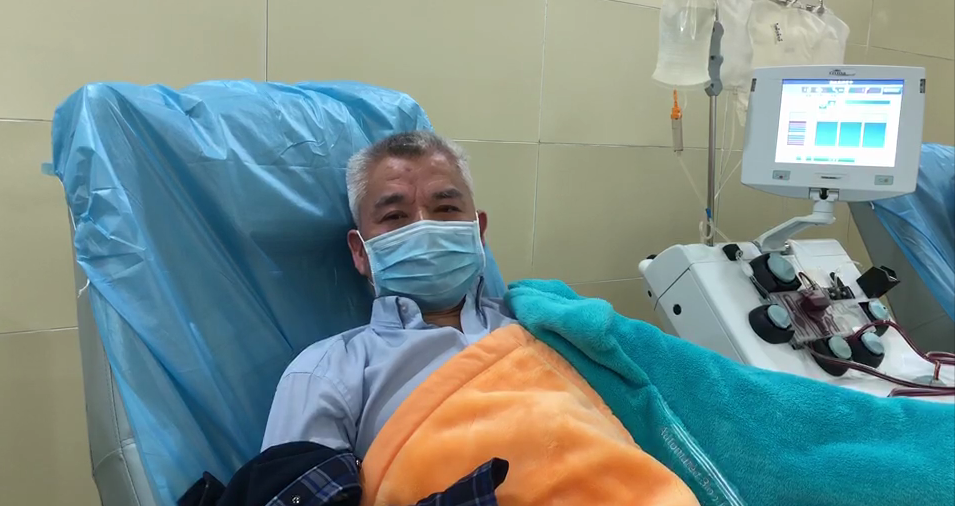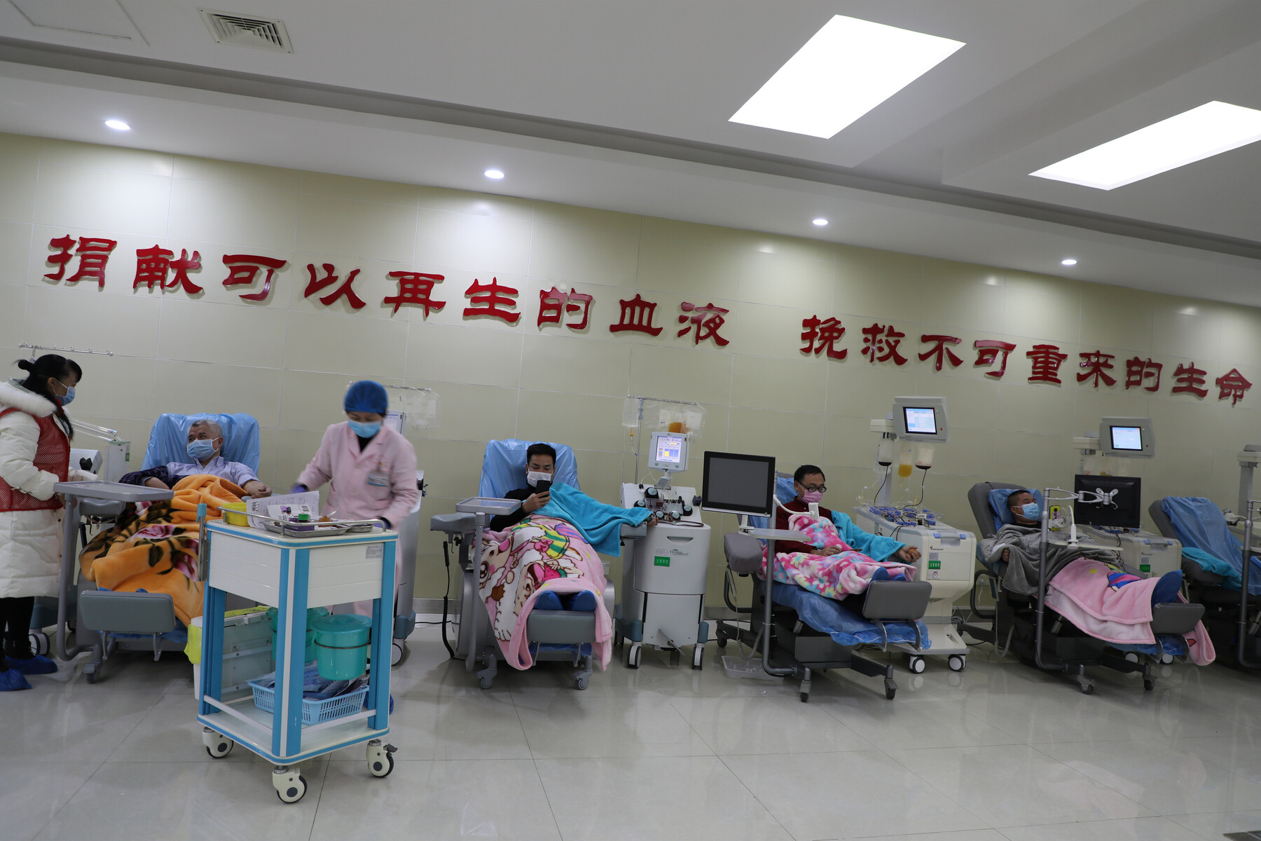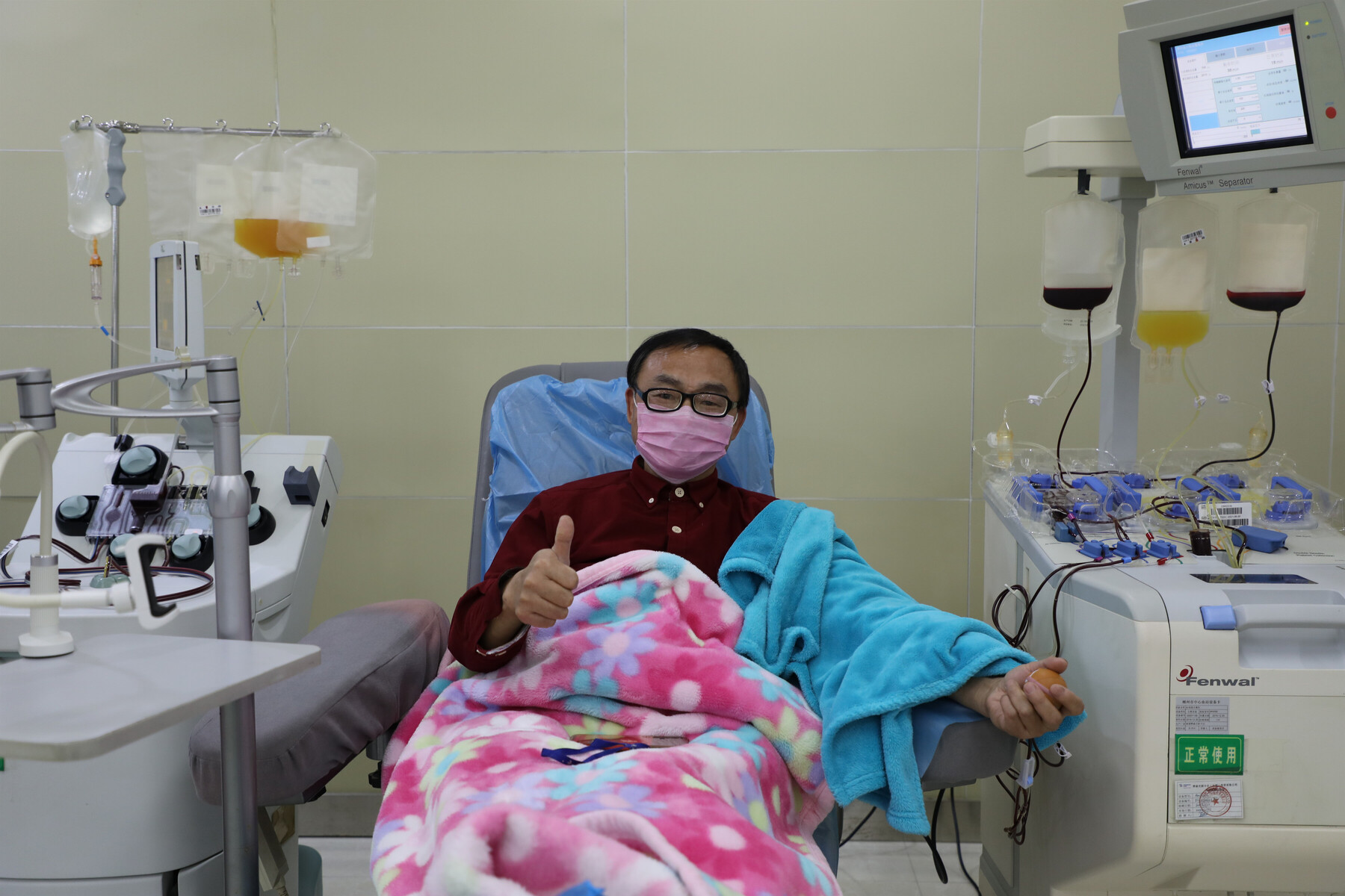 (安仁县实验学校原副校长唐白良正在献机采血小板)