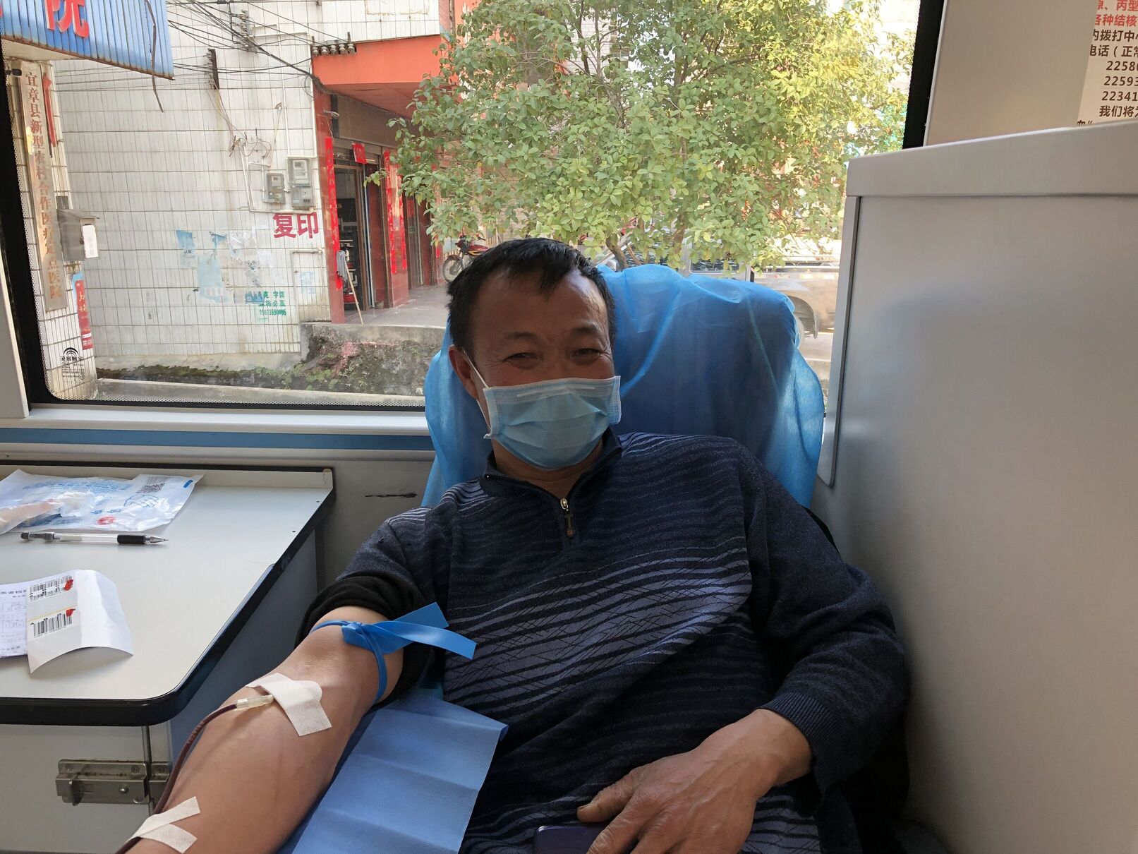 (农村应急献血者谭胜祥正在献血)