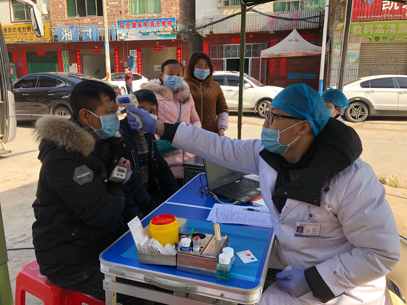 (市中心血站工作人员正在为献血者测量体温)