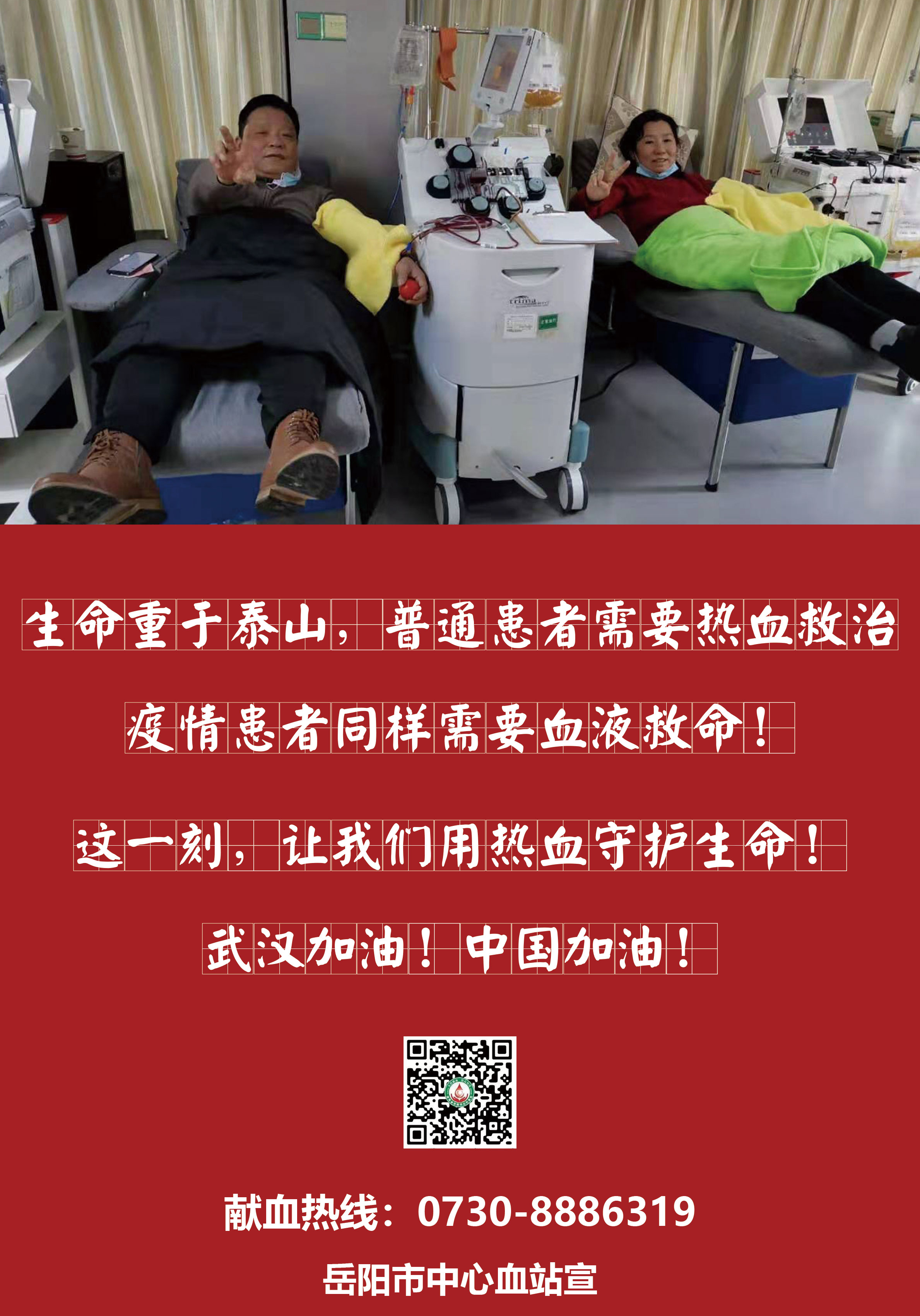 生命重于泰山,普通患者需要热血救治,疫情患者同样需要血液救命。在抗疫防病的“非常时期”,无偿献血就是支援抗疫前线!诚挚欢迎社会各界爱心人士伸出手臂加入到无偿献血的行列中,这一刻,让我们用热血守护生命!武汉加油!中国加油!