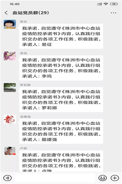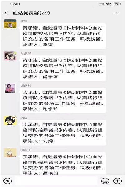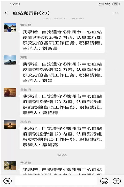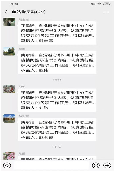 2月3日,株洲市中心血站响应卫健委党委号召,通过网上传递、微信推送的方式开展党员签订《株洲市中心血站疫情防控承诺书》活动,27名在职党员积极提交了承诺书。