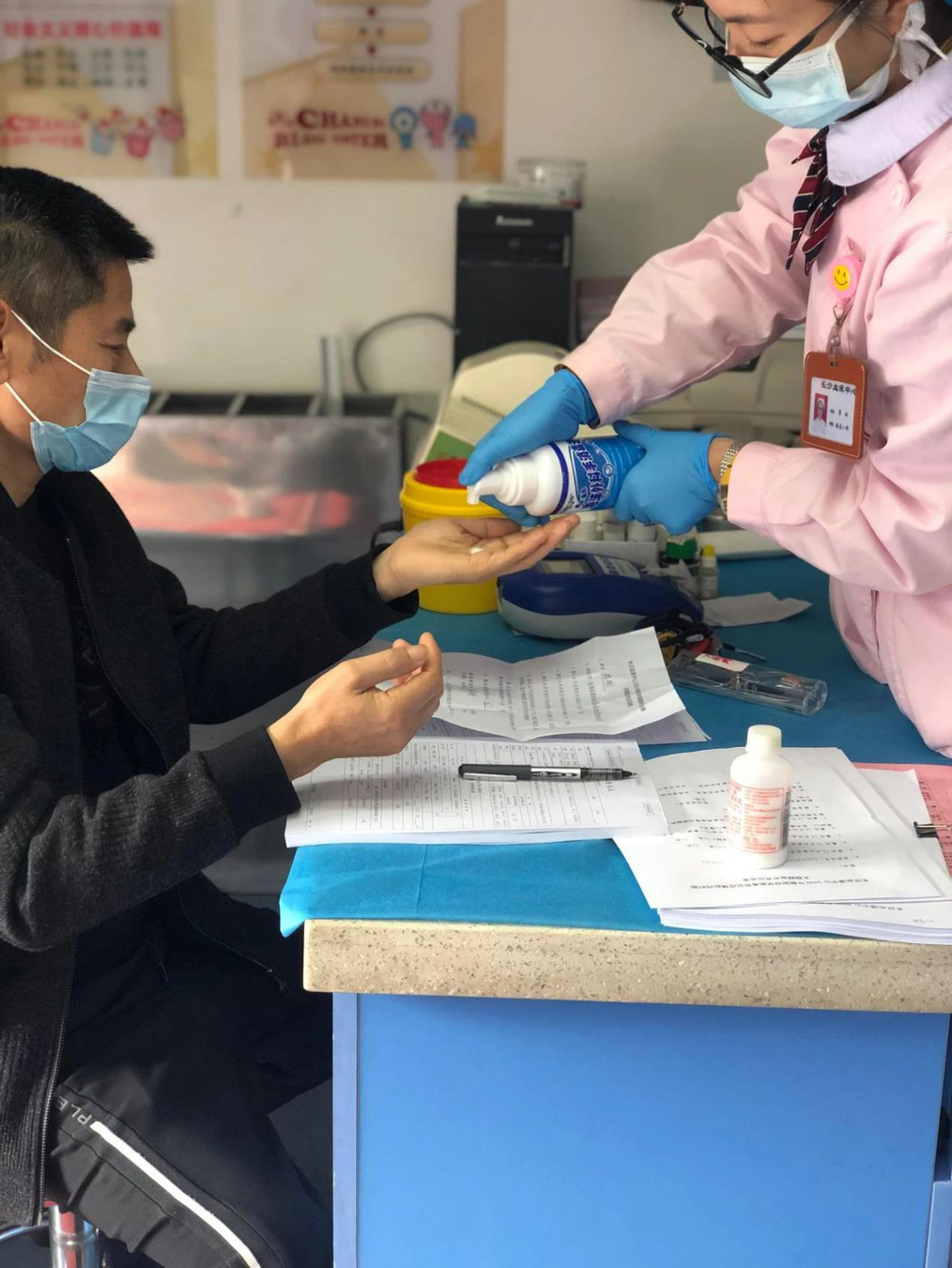 帮助献血者进行手部消毒。