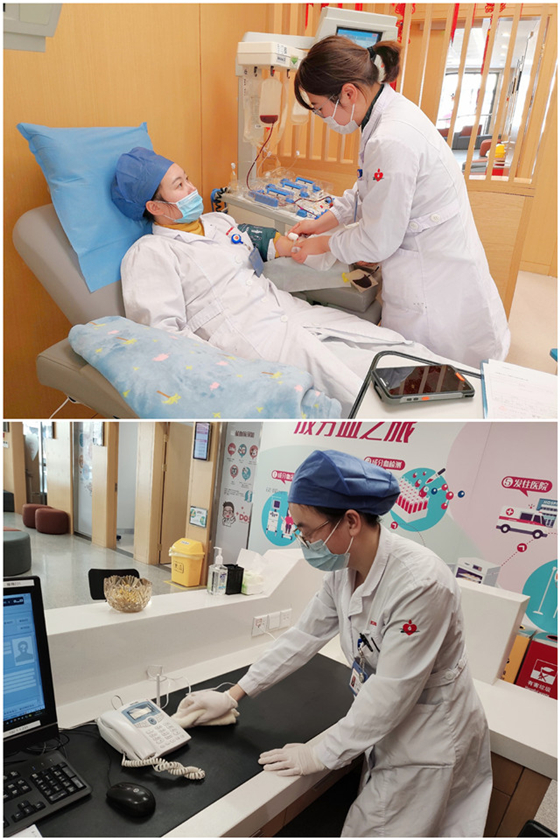 疫情期间,严格防控,刻不容缓。特殊时期,为了让广大献血者更安心、更放心,献血服务二科张晗倩严格按照疫情防控要求操作,用心采集好每一袋血液;献血服务二科虞丹华,在做好献血者接待、服务等工作的同时,认真做好献血场所的消杀工作,确保献血环境的安全与卫生。