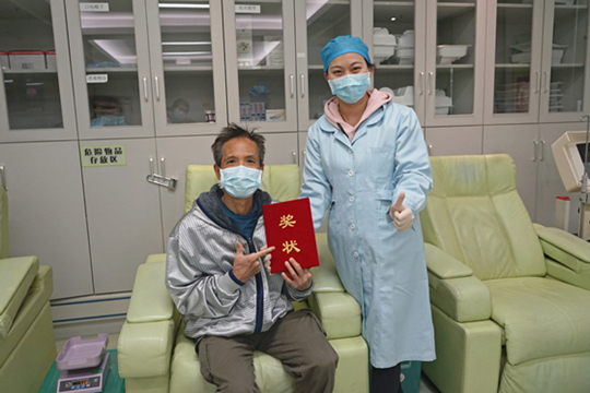 收到血站送上的印有“大爱无疆终身奉献奖”的荣誉证书时,口罩后的邓先生露出了惊喜而真诚地笑容。