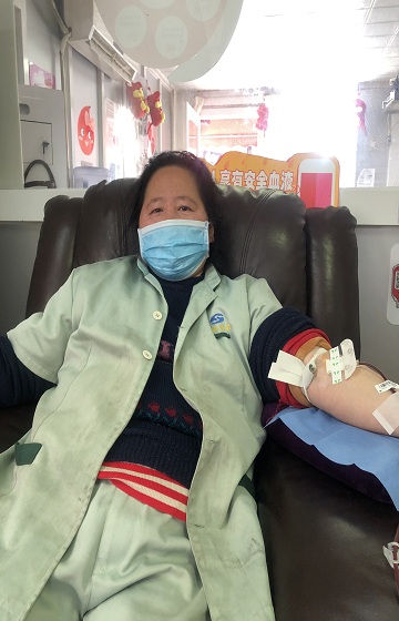 朱小荣,她是在超市打扫的一名清洁工,也是我们血站的固定献血者,当我们给她打电话告诉她用血紧张时,她还在工作,谁知道中午她就请假过来献血了。她说能早点来就能早点帮助病人,希望这次疫情能尽快过去!