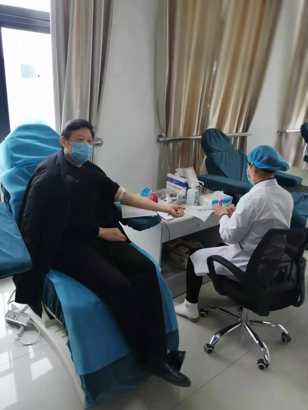 血站党支部书记王金林带头献血,他说,一定要把人民群众生命安全和身体健康放在第一位,要以战斗姿态扛起政治责任,用实际行动坚定信心,众志成城,一定打赢阻击新冠肺炎这场战役,守护天中大地人民群众的健康和生命。